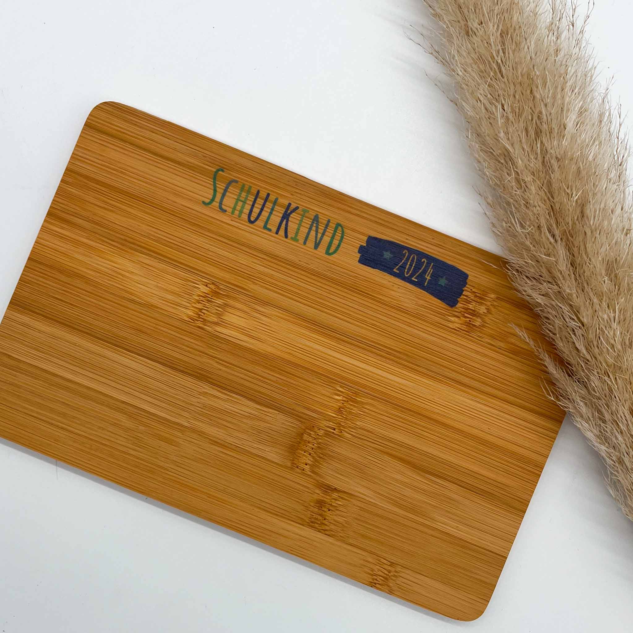 Das perfekte Geschenk zum Start in die Schule ist dieses Frühstücksbrettchen. Das Frühstücksbrettchen Schulkind kannst du mit zwei unterschiedlichen Farben erwerben. Das Frühstücksbrett ist aus Bambus und hat die Maße 22 x 14 cm. Es wird mit einem speziellen Druckverfahren auf das Brett personalisiert.
