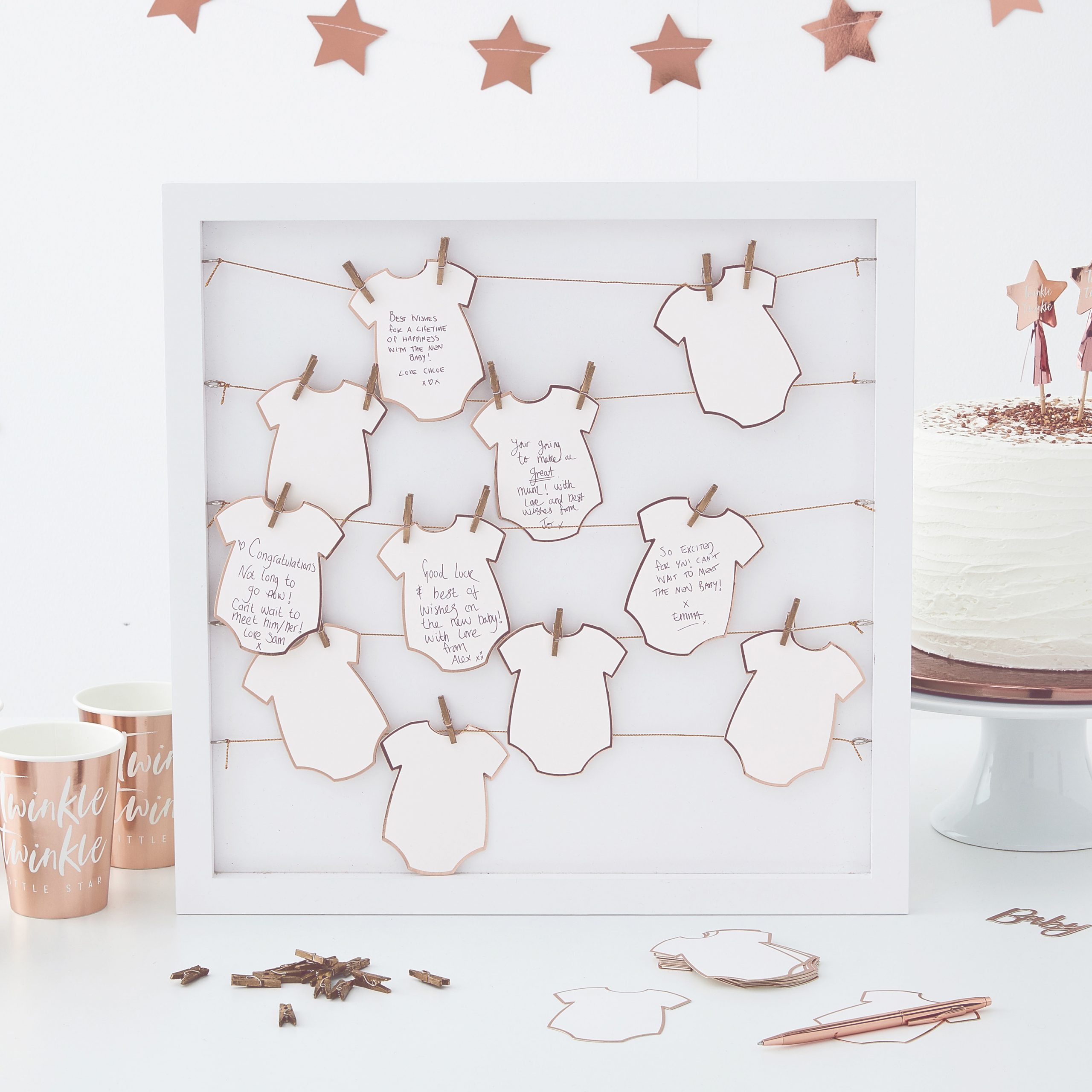 Das Gästebuch in einem weißen Rahmen ist perfekt für deine Babyshower um all die Wünsche, Botschaften und Fotos von diesem tollen Event festzuhalten. Der Rahmen hat die Maße 40 x 40 cm und du erhältst 24 Mini Babybodyblätter um Texte für die werdenden Eltern und das Baby zu schreiben. Zusätzlich erhältst du 24 kleine Holz Wäscheklammern und eine 40 cm Schnurr.