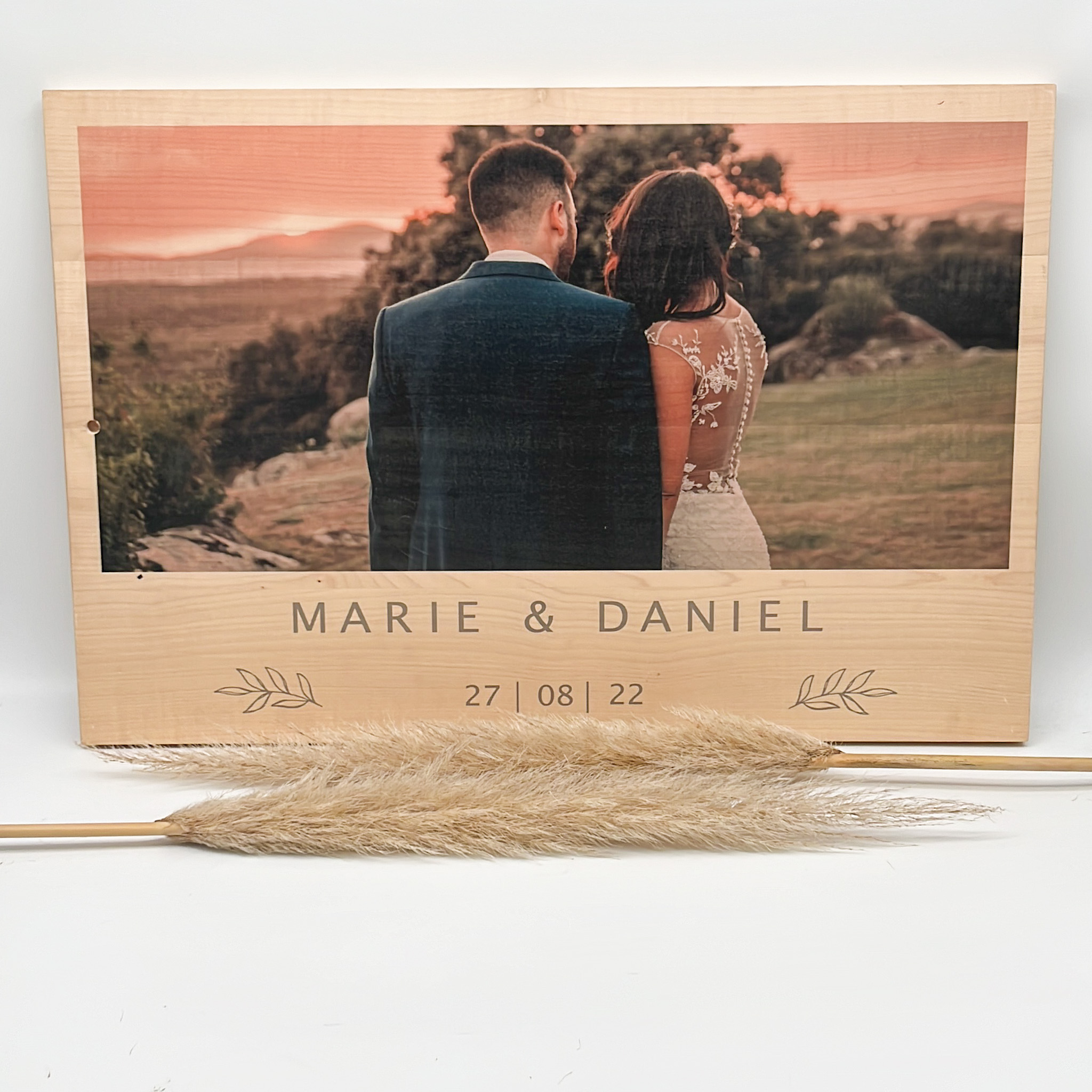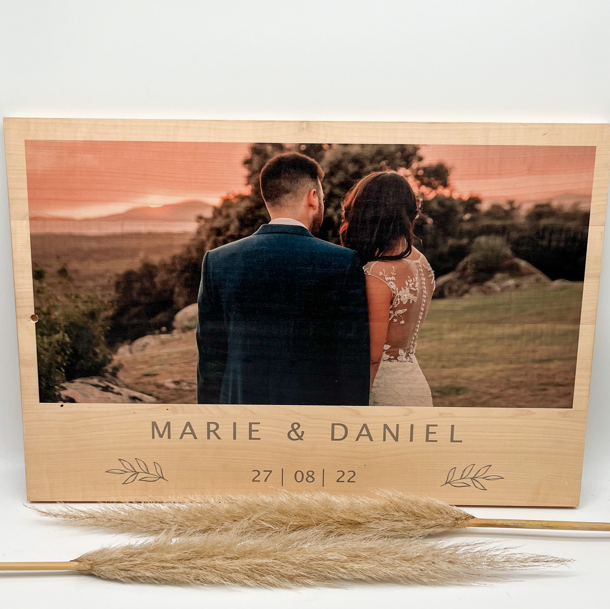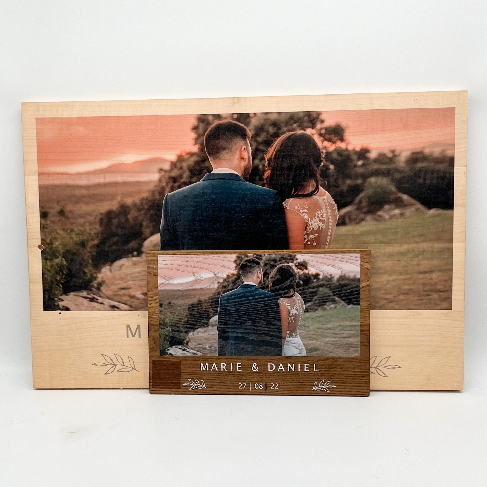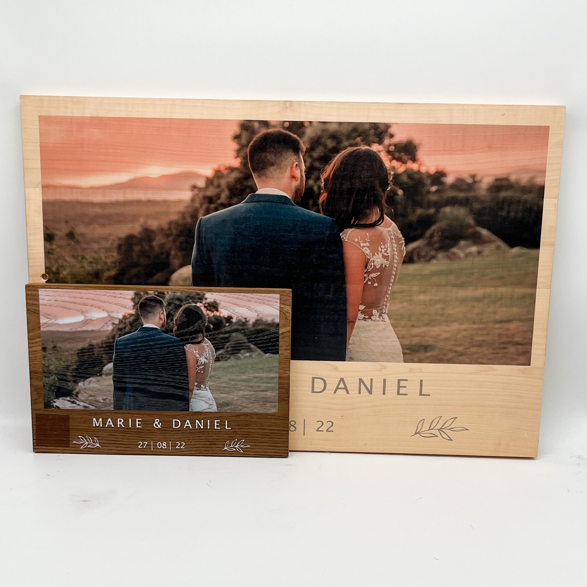 Dieses hochwertige Holzbild ist etwas ganz Besondere. Verschenke es an dein Brautpaar. Wir personalisieren es nicht nur mit dem schönsten Hochzeitsfoto sondern auch mit dem Datum und Name. Du kannst das Hochzeitsbild in drei verschiedenen Größen bekommen, sowie zwei verschieden Holzarten. Auf der Rückseite kannst du das Holzbild