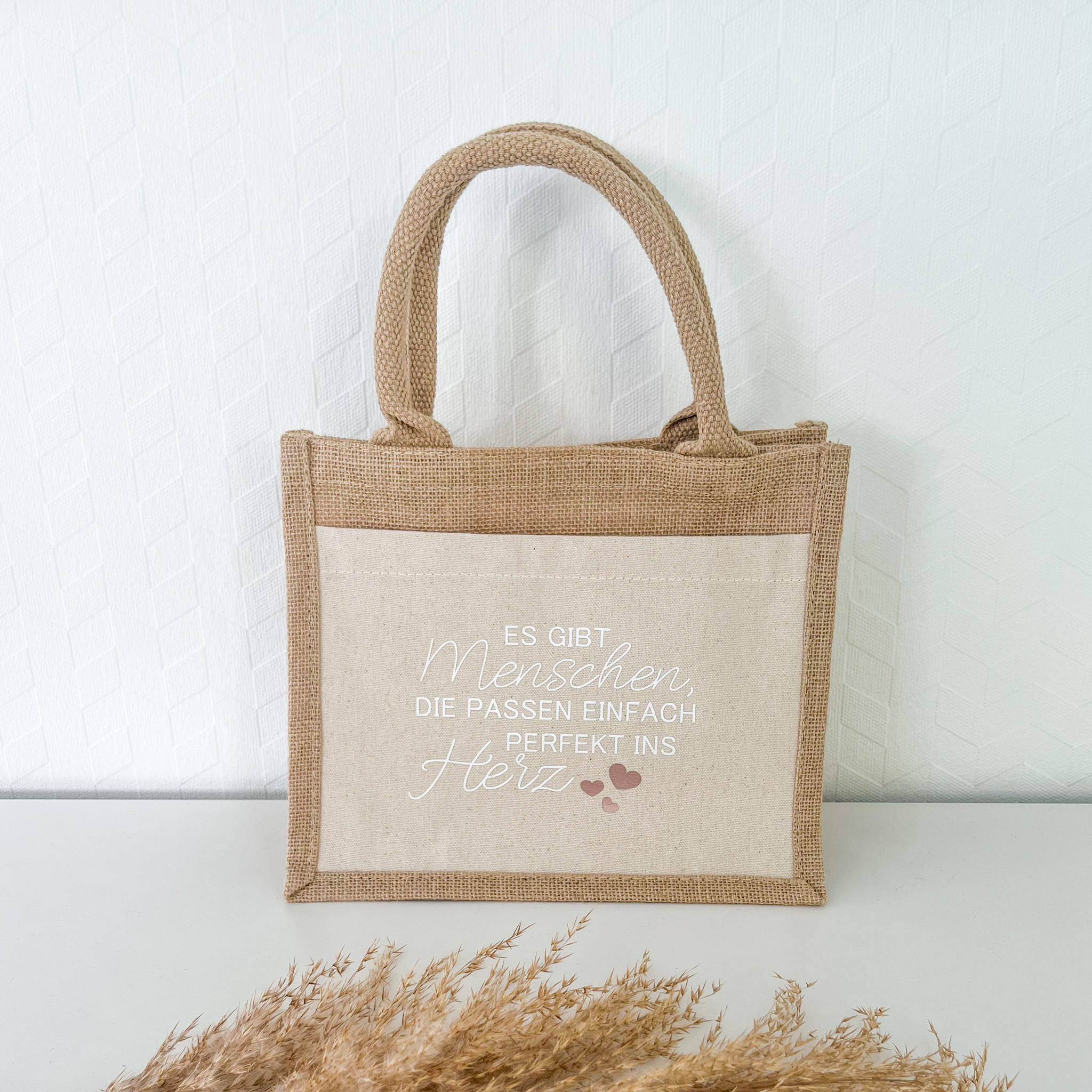 Dein Geschenk für die Beste Freundin, diese süße Jute Tasche. Der Spruch: Es gibt Menschen, die passen perfekt in dein Herz. Als Geschenkidee empfehlen wir dir dazu, die Lieblingsschokolade, das Lieblingsgetränk oder ein paar Blumen dazu zu packen! So hast du ein tolles Geschenk für die Beste Freundin. Das schöne an dieser Jute Tasche ist, dass du sie nach deinen Farbwünschen zusammen stellen kannst.