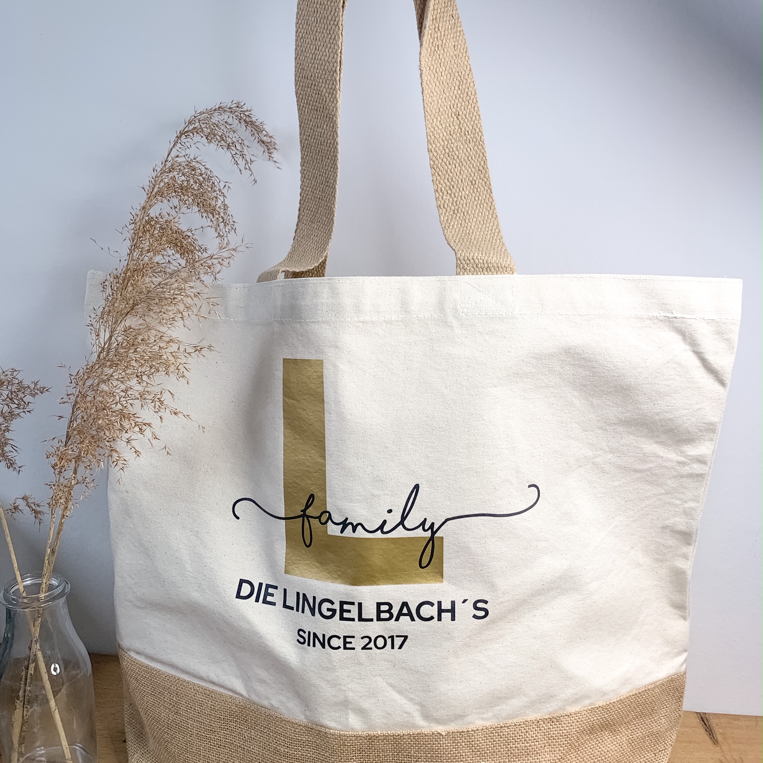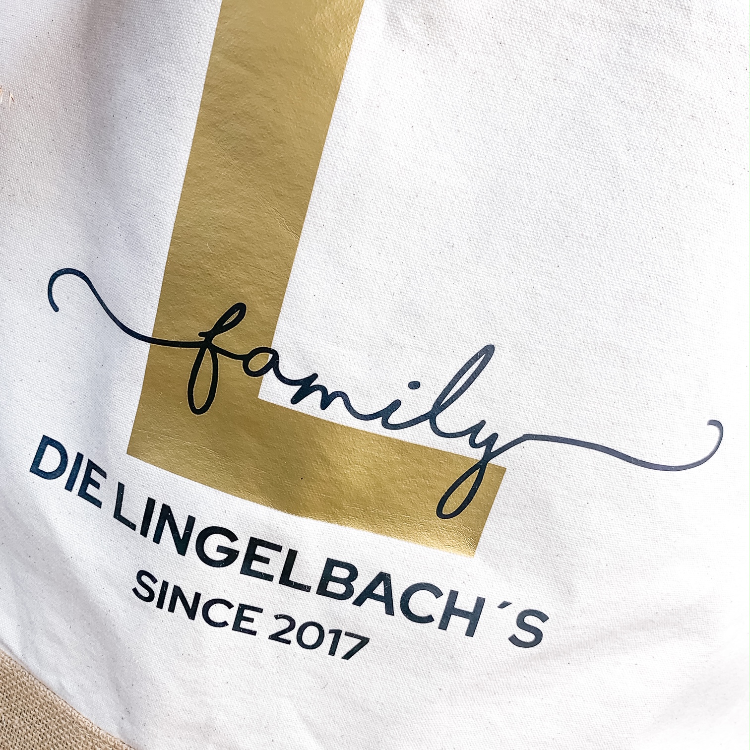 Der Shopper wird personalisiert mit dem Initial deines Familiennamens und du kannst entscheiden, ob du die Jahreszahl auf deinem Shopper wünschst oder nicht. Ebenso steht dein Familienname wie hier im Beispiel mit DIE „LINGELBACH´S“ auf deiner personalisierten Tasche.
