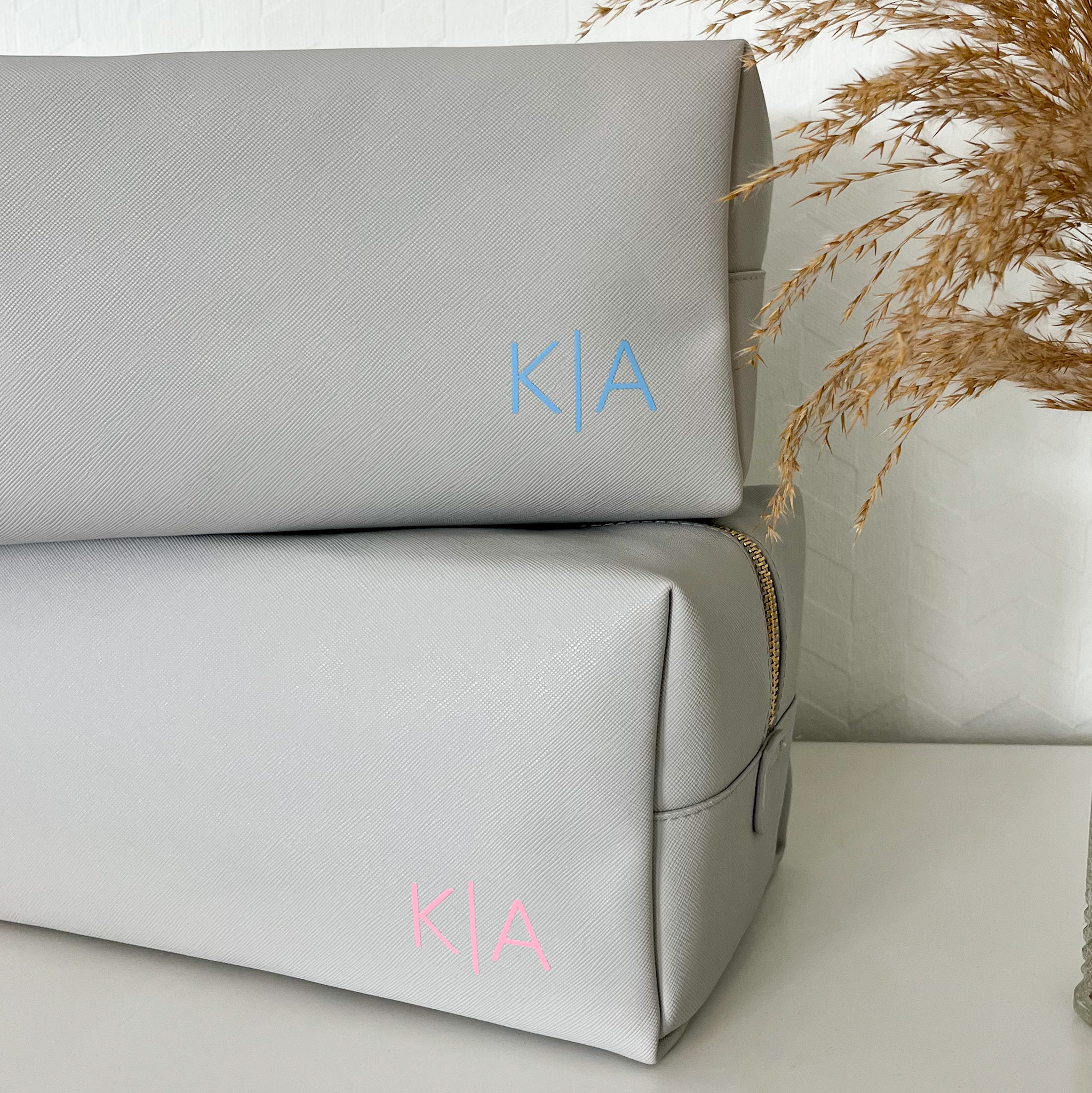 Diese schöne eckige Kosmetiktasche bieten wir in zwei Größen an. Die Kosmetiktasche mit Initialen wird in deiner Wunschfarbe personalisiert. Die Kosmetiktasche ist aus einem sehr robusten Material und beide Größen ermöglicht es, um alles Wichtige bei sich zu tragen, wenn es auf Reisen geht.