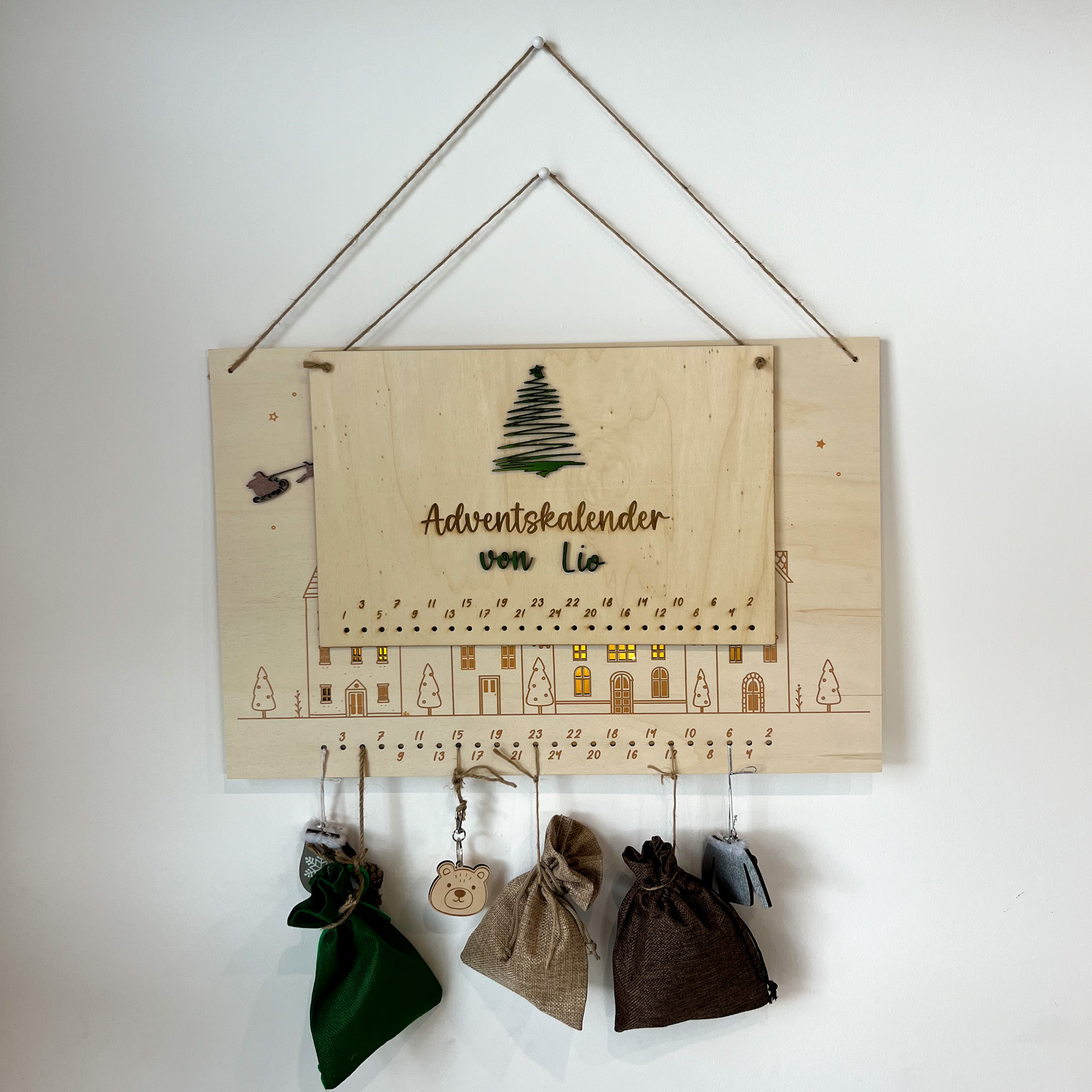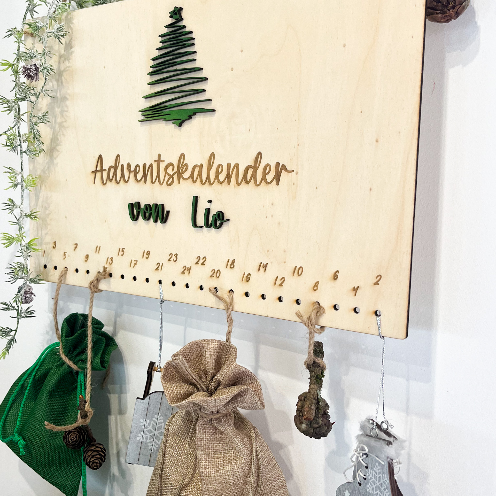 Der perfekte personalisierte Adventskalender aus Holz mit deinem Namen. Der personalisierte Adventskalender ist super um die Kinderaugen in der Vorweihnachtszeit zum Strahlen zu bringer. Er begleitet sie durch ihren Alltag, bis der Weihnachtsmann kommt. Wir haben bei dem Adventskalender darauf geachtet, dass die Zahlen so angelegt sind, dass auch wenn wir am 24. Türchen sind, der Adventskalender in Balance ist. Jeder Adventskalender wird von uns in Handarbeit gefertigt und wir verpacken ihn dir sicher, dass du dich über dein Schmuckstück zu Hause freuen kannst.
