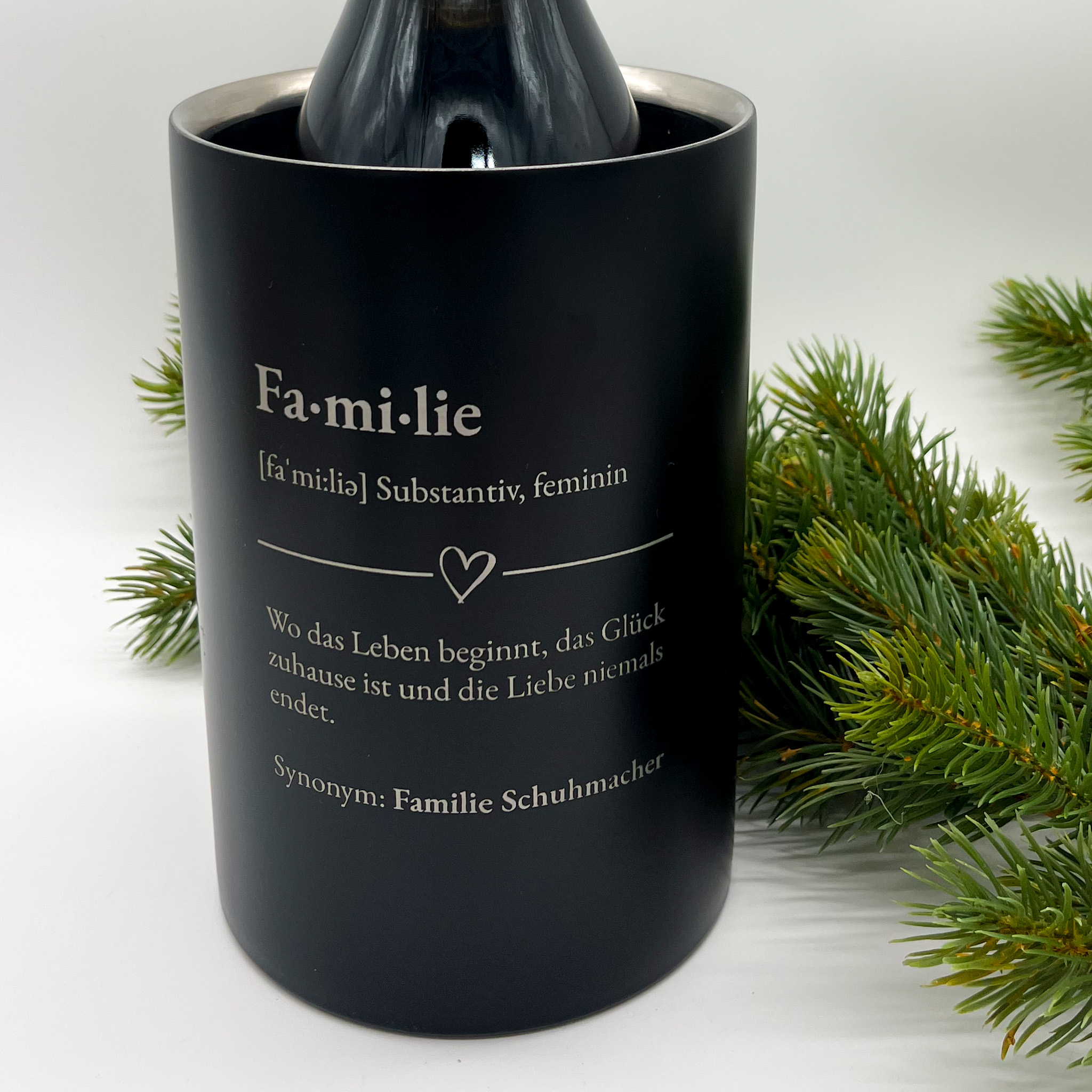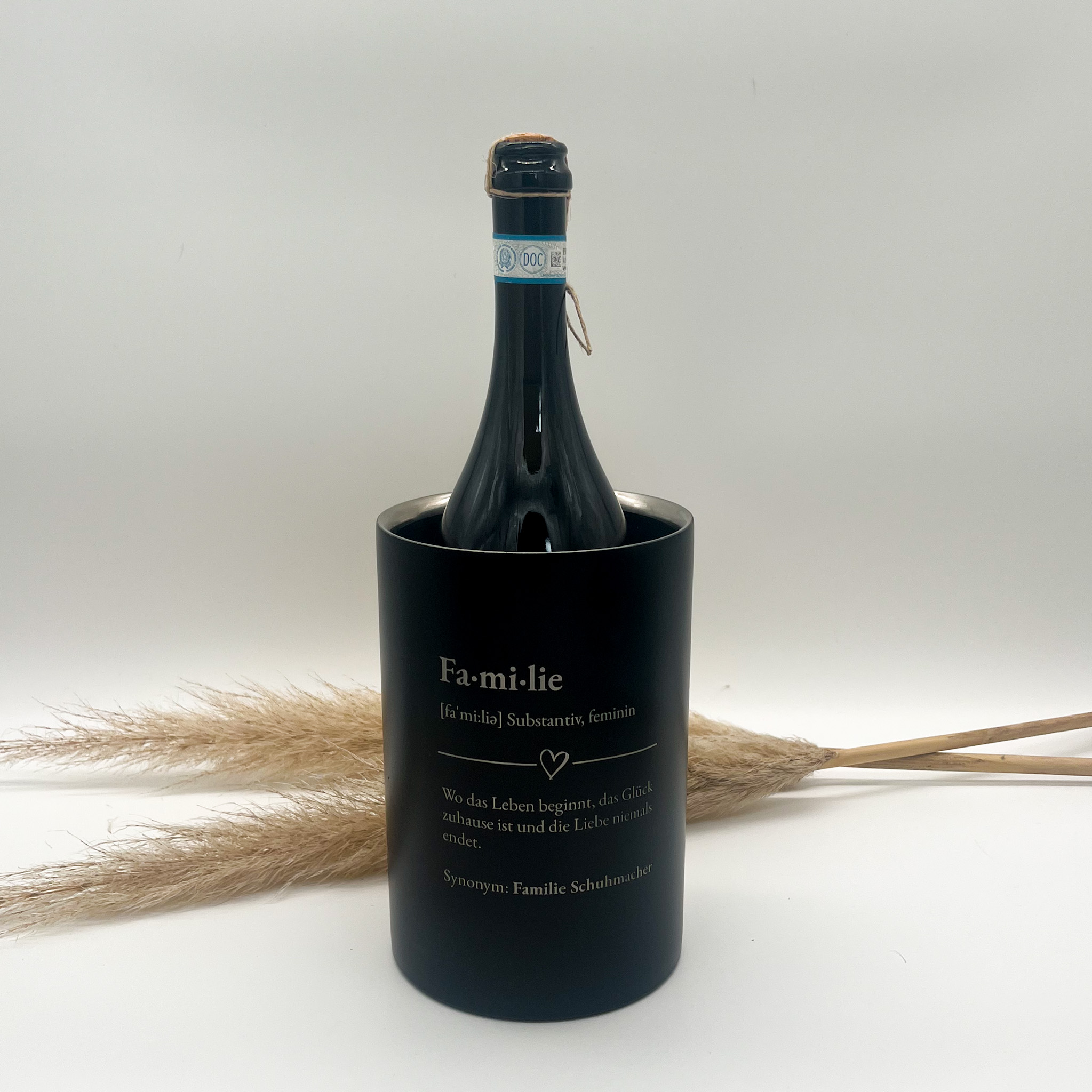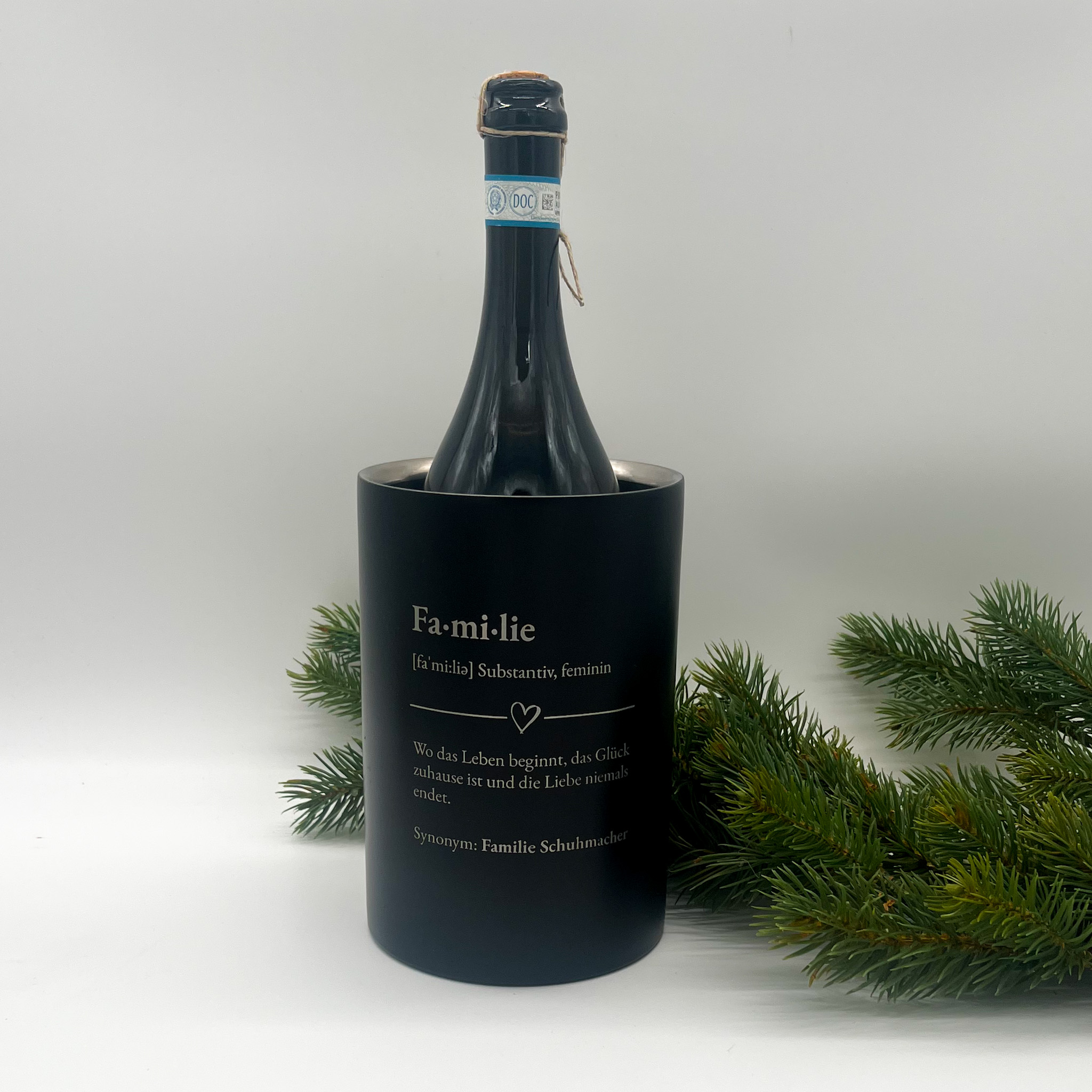 Personalisierter schwarzer Weinkühler für die Familie. Mit dem Spruch: Wo das Leben beginnt, das Glück zu Hause ist und Liebe niemals endet, sowie dem Namen der Familie. Es das perfekte Geschenk, egal ob zum Muttertag, Vatertag, die Hochzeit oder als Weihnachtsgeschenk. Der schwarze Weinkühler ist ein echter Hingucker auf dem Tisch. Der Schriftzug wird graviert und ist besonders langlebig. Der schwarz matte Weinkühler hat die Maße von eine Höhe von ca. 18 cm und einen Durchmesser von ca. 12 cm.
