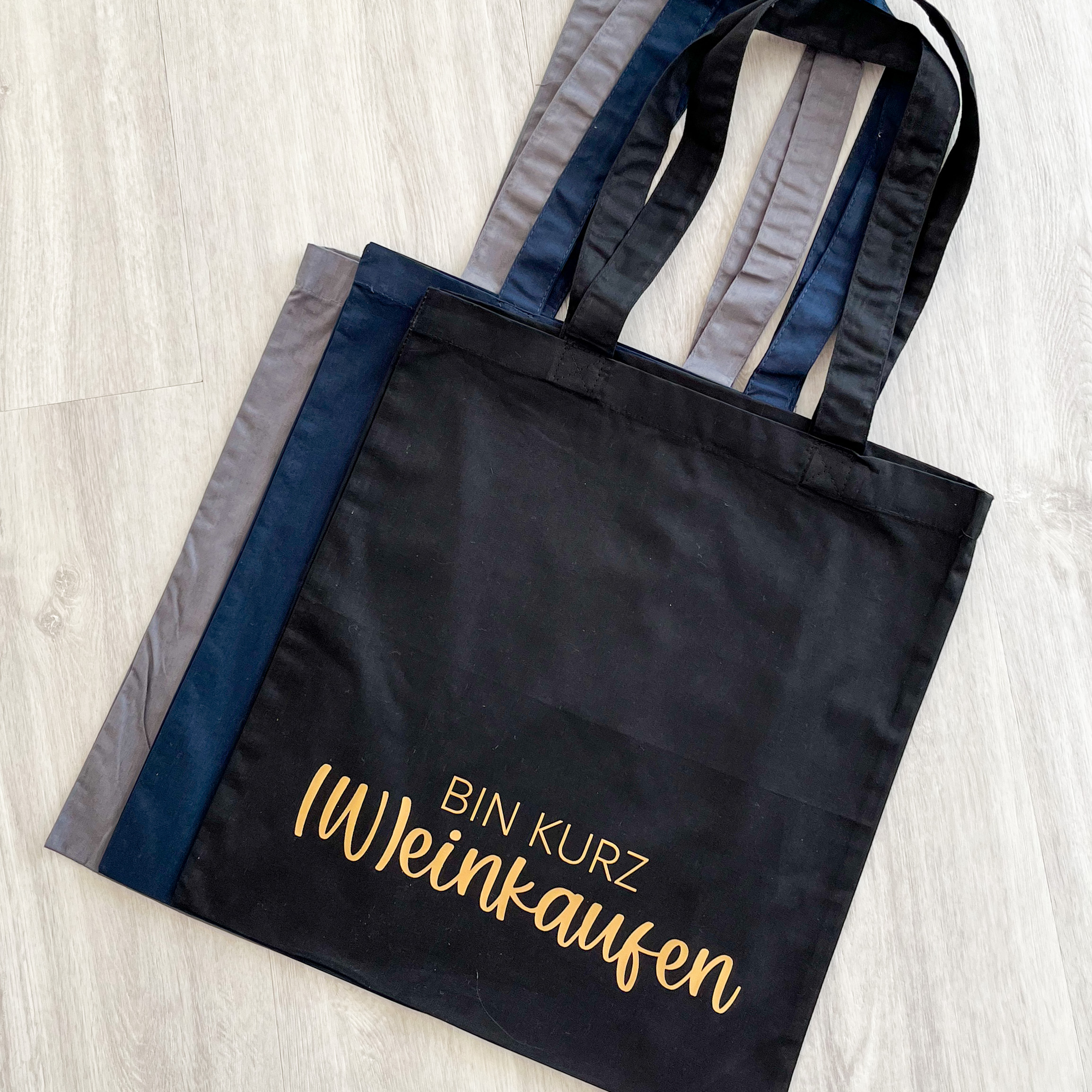 Stofftasche mit Bin kurz (W)einkaufen. Das perfekte Geschenk für die beste Freundin, wenn man auf der Suche nach einer Kleinigkeit zum Verschenken ist.