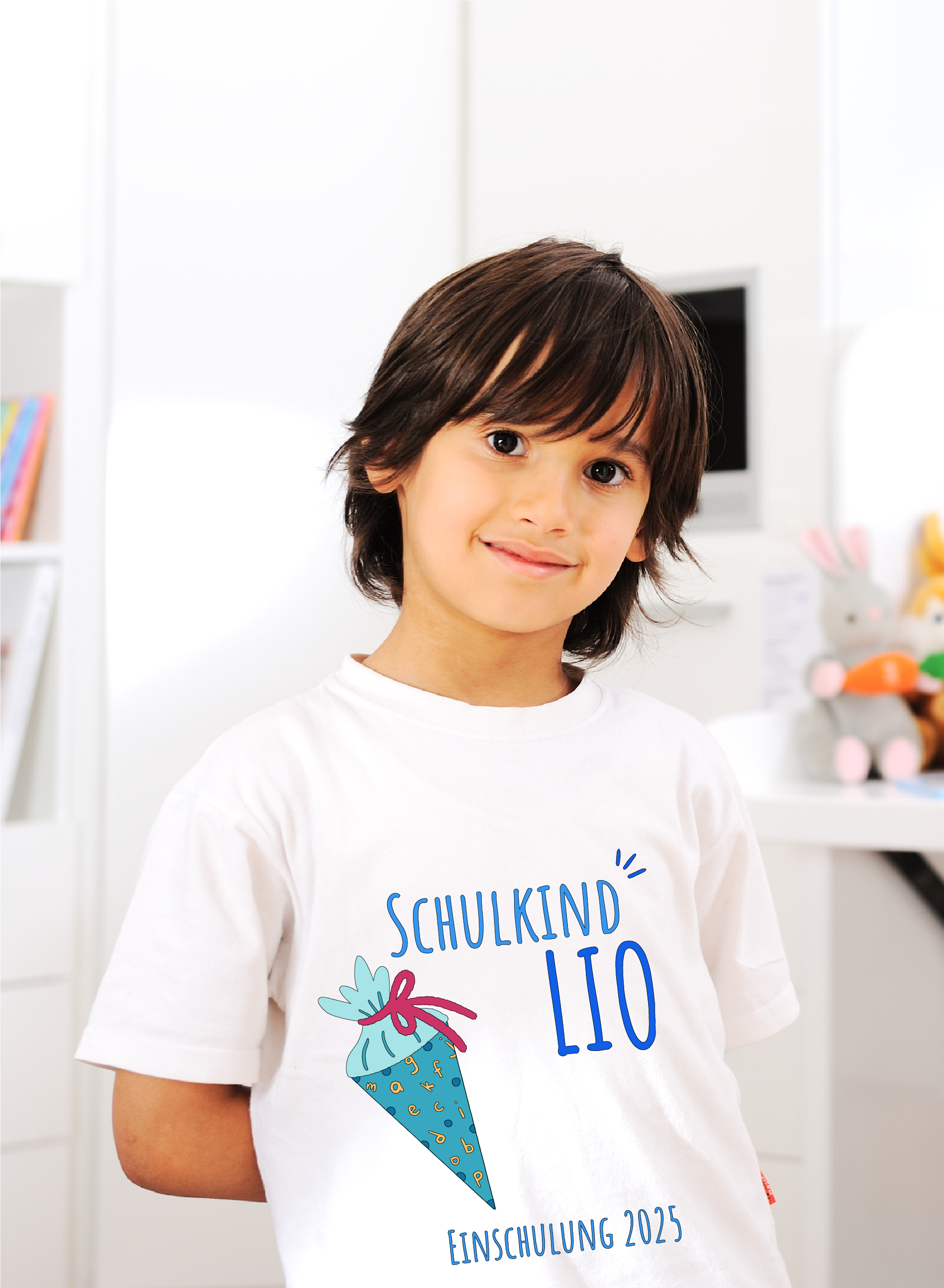- Design: Mittiger Aufdruck mit Schultüte, Name und „Schulkind“-Schriftzug