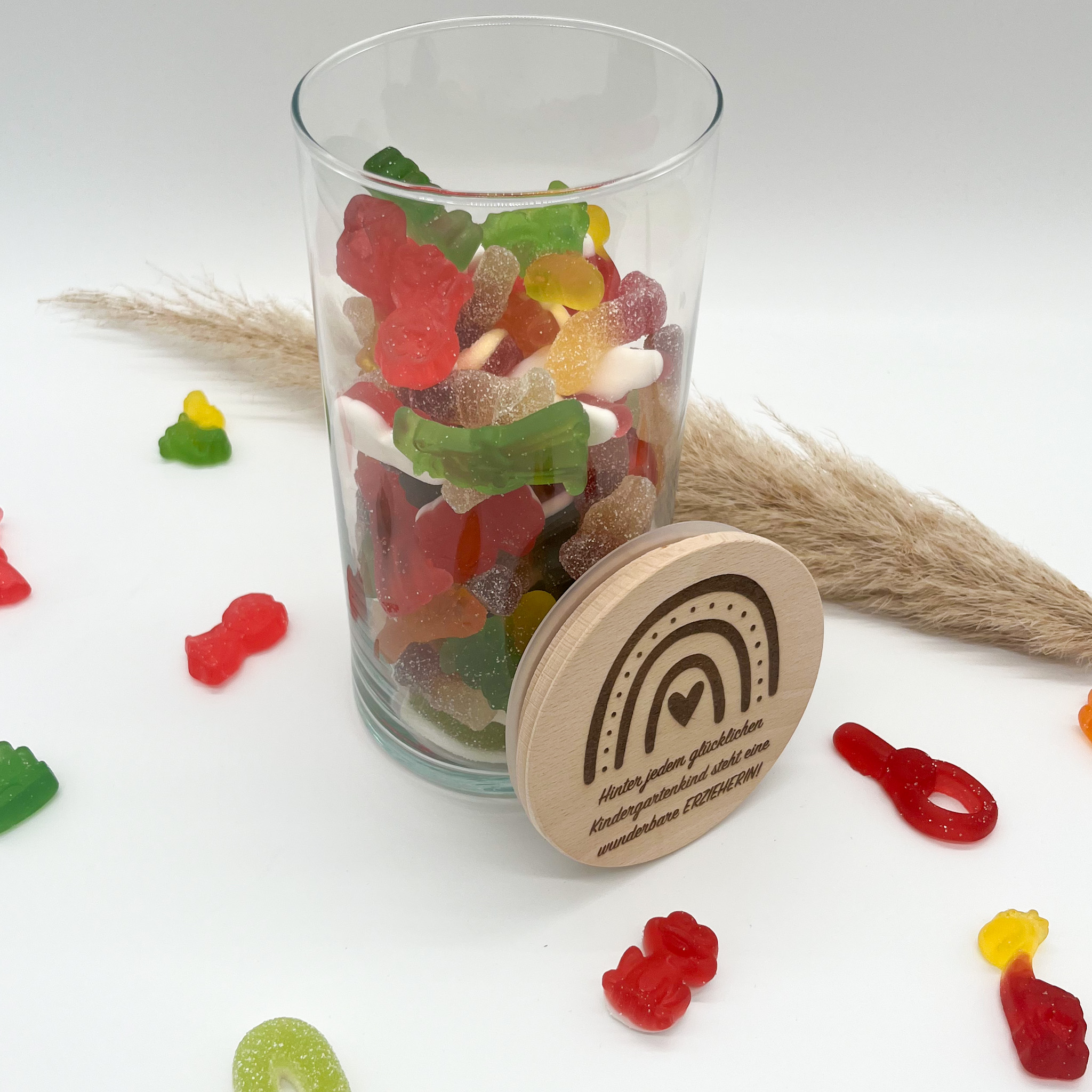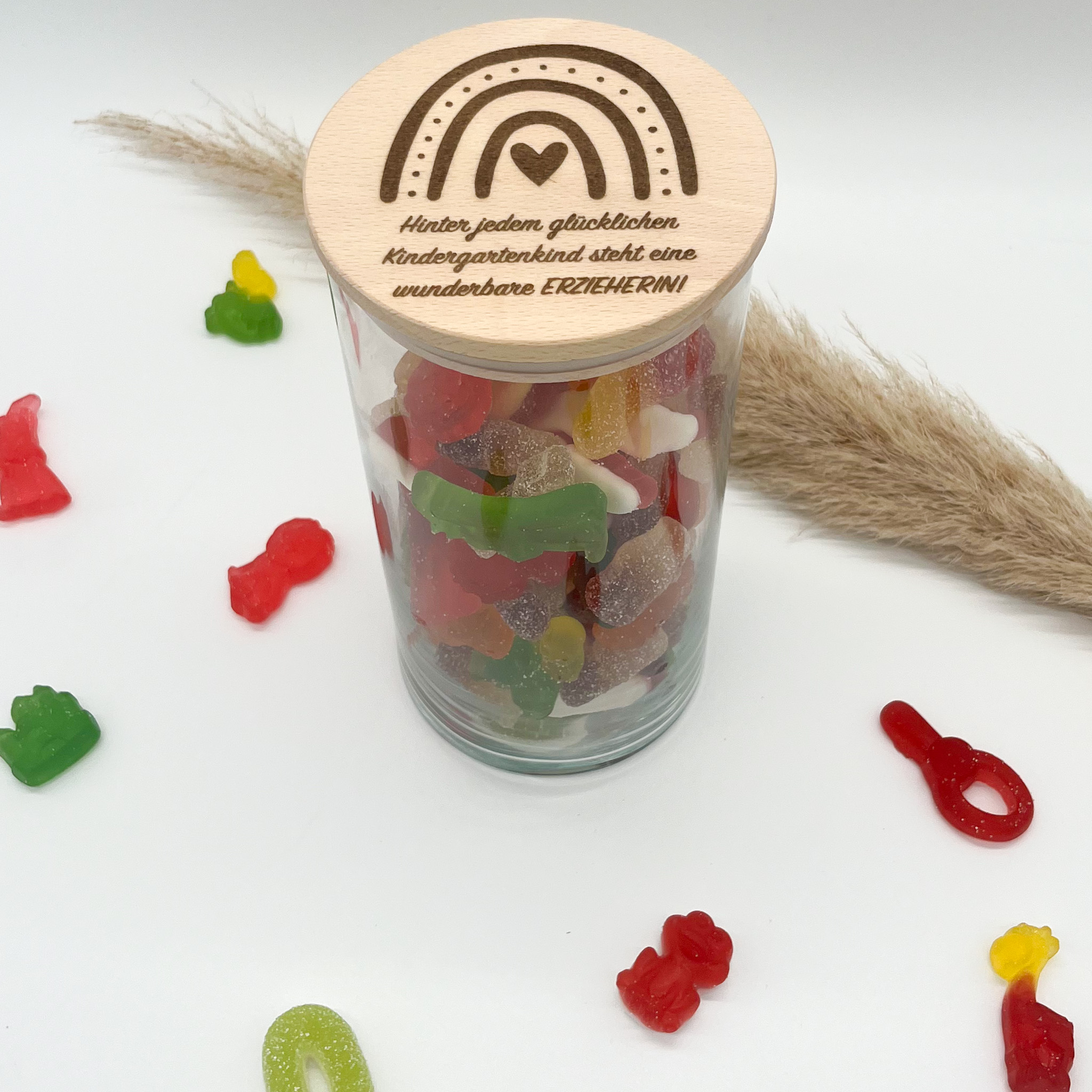Es ist Zeit DANKE zu sagen, an deine Erzieher oder Tagesmutter. Wie wäre es mit diesem süßen Vorratsglas mit der Aufschrift: Hinter jedem glücklichen Kindergartenkind steht eine wunderbare Erzieherin. Gerne personalisierten wir es dir auch mit dem Wort Tagesmutter. Wir finden es ist das perfekte Geschenk, denn mit einem Aufbewahrungsglas kann man immer etwas anfangen. Somit hat deine Erzieherin langfristig etwas von dem Geschenk. Wir empfehlen dir noch ein paar Süßigkeiten, oder selbstgebackende Plätzchen dazu zu geben und das Abschiedsgeschenk ist damit perfekt.
